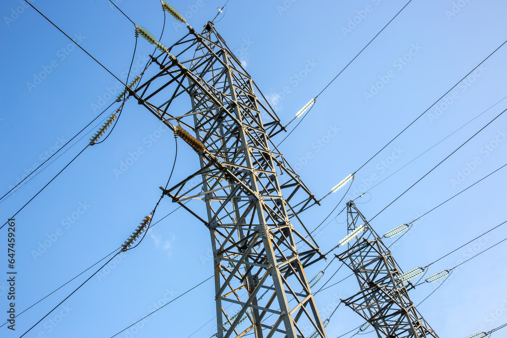 power line support with wires for electricity transmission. High voltage grid tower with wire cable at distribution station. Energy industry.