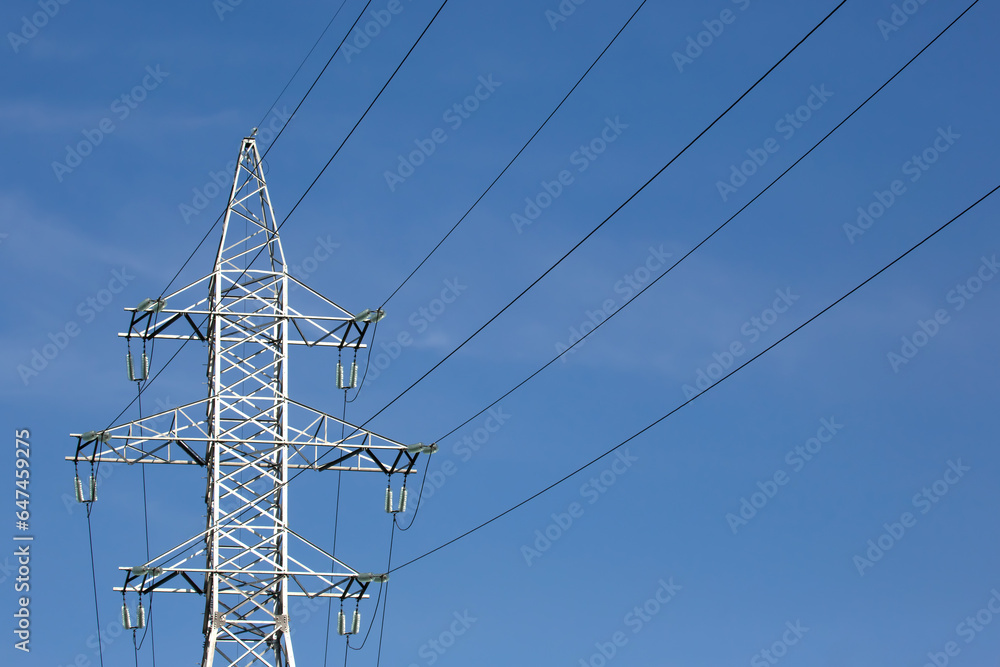Electrical tower with voltage transmission wires against the background of blue sky. High voltage tower. power line support with wires for electricity transmission. Energy industry.