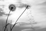 Dandelion seeds are flying against the background of the sunset sky. Floral botany of nature