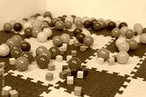 wooden block toy and colorful plastic balls on mat or jigsaw floor