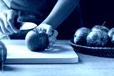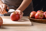 Red apple fruit with hand holding knife for cutting on wooden board, Healthy eating
