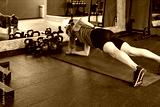 Full body woman. Female athlete training plank exercise on mat with heavy dumbbells during intense workout in gym. Healthy lifestyle concept.