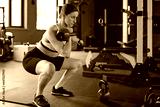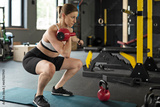 Athlete woman in a squad with heavy dumbbells has power and strength to training body and active crossfit in gym indoors. Healthy lifestyle and workout.