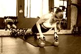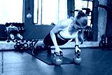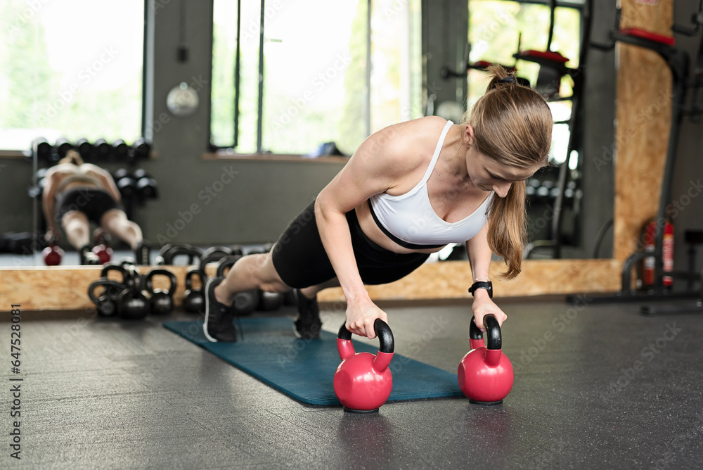 Full body woman. Female athlete training plank exercise on mat with heavy dumbbells during intense workout in gym. Healthy lifestyle concept.