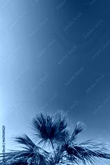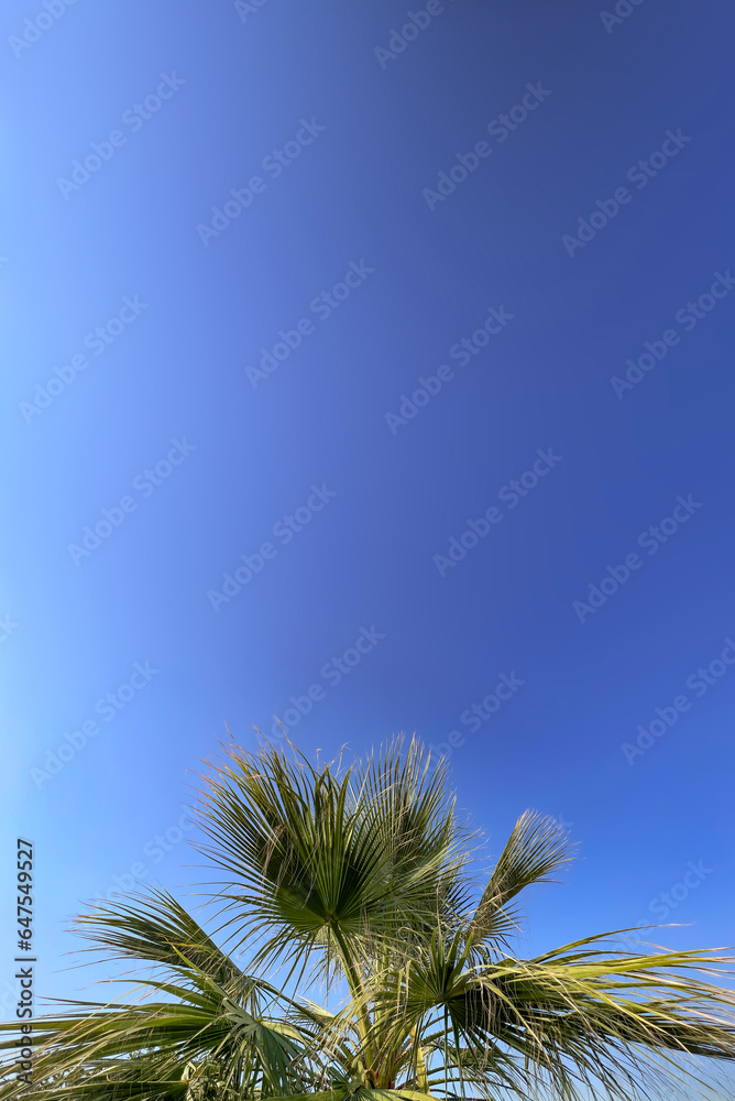 Tropical palm tree and sunlight on beautiful blue sky background with copy space. Summer vacation and nature travel adventure concept. Vertical composition.