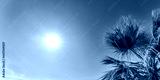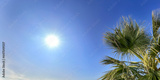 Tropical palm tree and bright sun light on beautiful blue sky background with copy space. Summer vacation and nature travel adventure concept.