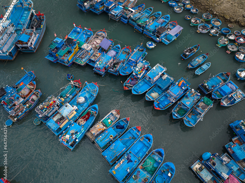 cargo ship in port Drone view fishing boats nailing side by side in My Tan port of Phan Rang, Ninh Thuan province
