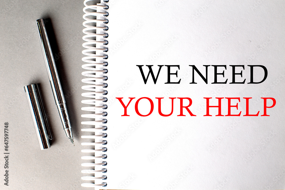 WE NEED YOUR HELP text on a notebook with pen on grey background