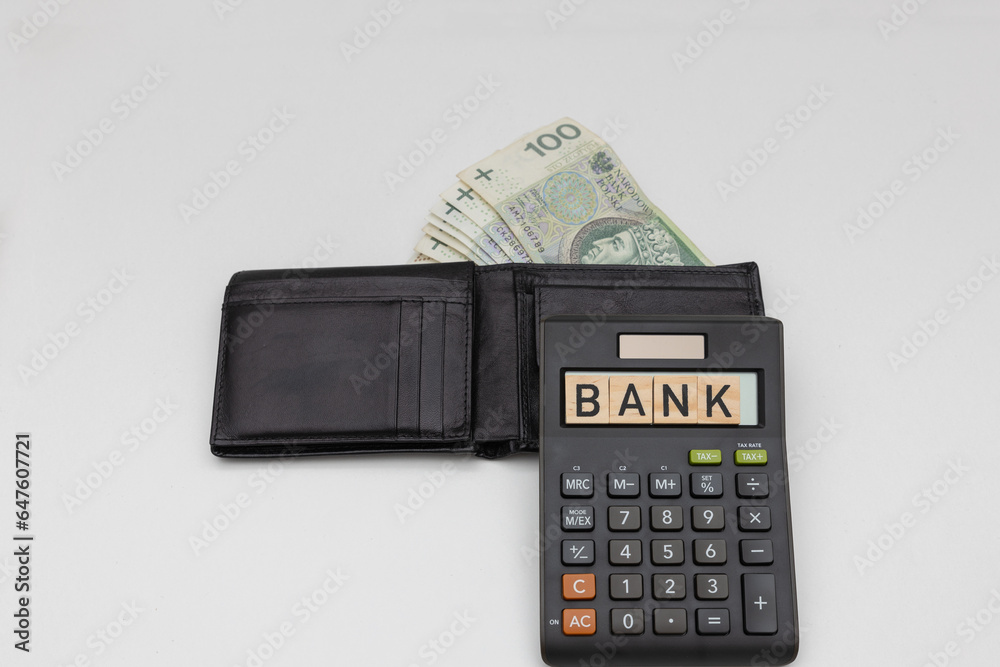 Wallets with banknotes of 100 zloty denominations next to which lies a wooden Bank sign on a calculator. The concept of spending during a crisis of inflation and recession.