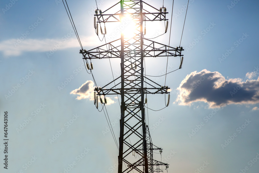 The concept of a source of electricity. Energy industry. High voltage tower with power wires against the background of the sun and clouds.