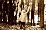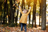 Childrens day. Happy adorable child girl 3-4 years having fun, playing with fallen leves, smiling, enjoying nice and sunny autumn day outdoors. Happy Childhood dream and freedom concept.