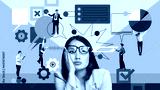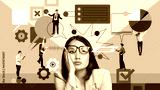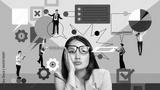Tired business woman. Deadlines and too many working tasks. Employees working on projects. Contemporary art collage. Concept of business, office, communication. Poster. Copy space for ad