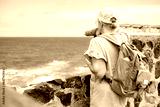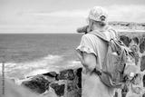 Back view of senior woman with cap looking at sea and horizon over water carrying backpack enjoying vacation or travel