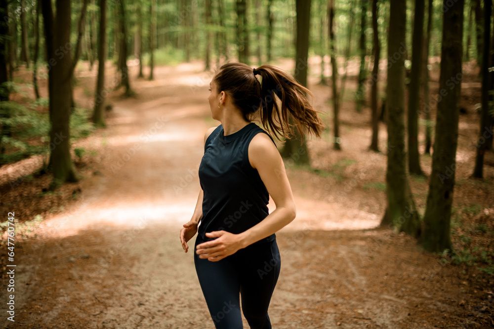 Sporty woman with long hair running in forest among trees and looking back, front view