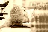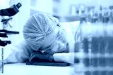 A tired female scientist working overtime in laboratory. Concept of exhausted, headache and stress while doing experiment, research or study in science area of workplace. A doctor work overload.