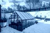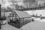 Winter view of private garden and greenhouse with collected things for winter. Gardening concept. Sweden.