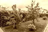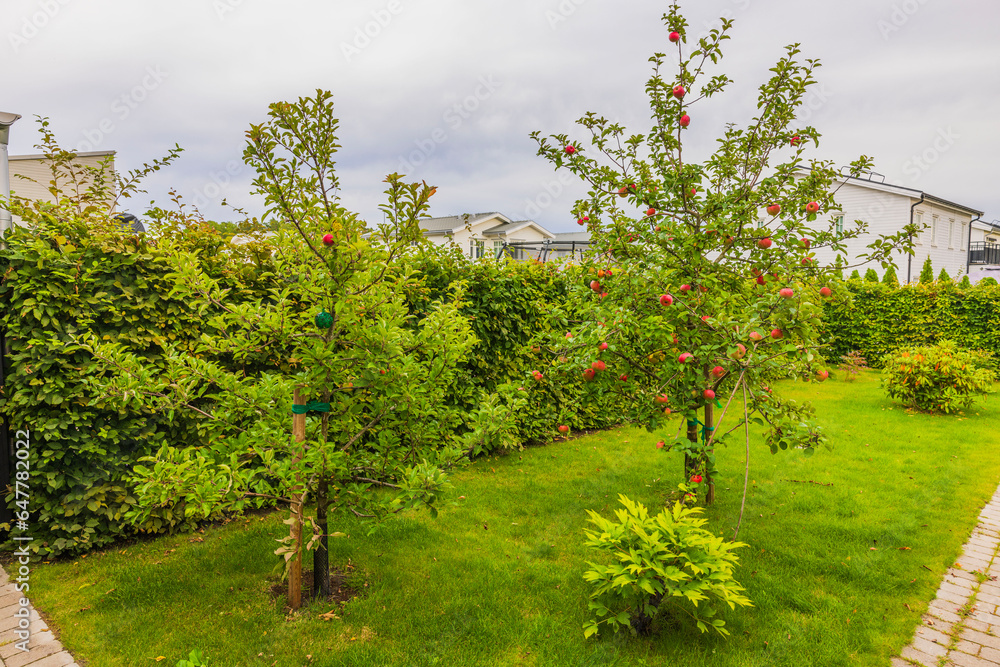 Beautiful view of garden with apple trees on cloudy autumn day. Sweden.
