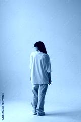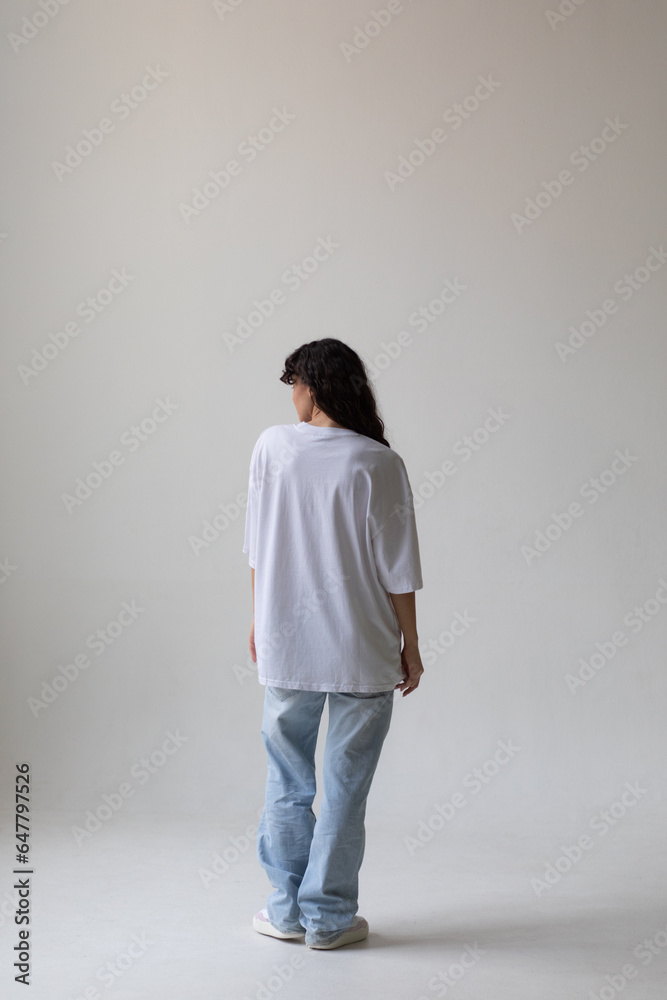 Beautiful brunette with curly hair in a white t-shirt and oversized jeans. Mock-up. Back view.