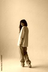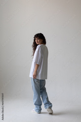 Beautiful brunette with curly hair in a white t-shirt and oversized jeans. Mock-up. Back view.