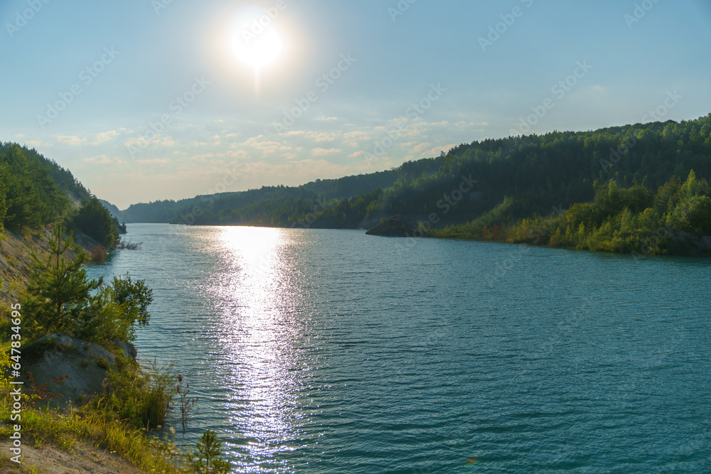 View of the lake among the lush green trees in the forest. Trees grow along the river and are reflected in the clear water. Natural landscape in the forest. River in the forest. uncontaminated nature