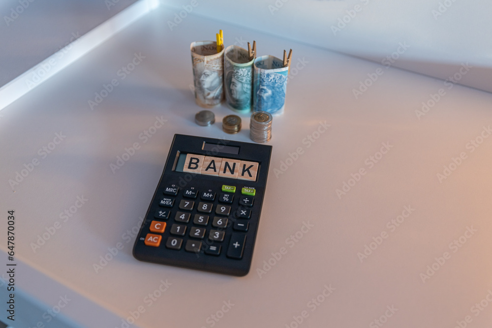 Banknotes stacked in a roll of 3 denominations of 50 zloty 100 and 200 zloty next to which lies the Bank's wood sign on a calculator. The concept of spending during the recession crisis.