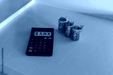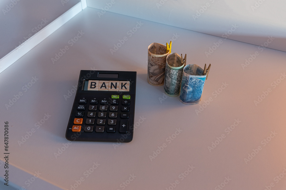 Banknotes stacked in a roll of 3 denominations of 50 zloty 100 and 200 zloty next to which lies the Bank's wood sign on a calculator. The concept of spending during the recession crisis.
