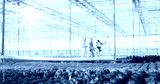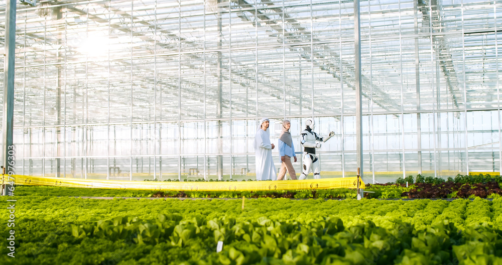 Automatic robot and muslim family walking between rows of organic salad at spacious greenhouse. Smart cyborg talking about new growing system with aquaponics technology.