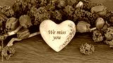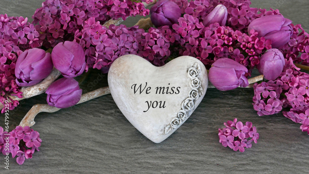 Condolence card: floral decorations and a labeled heart with the text we miss you.