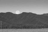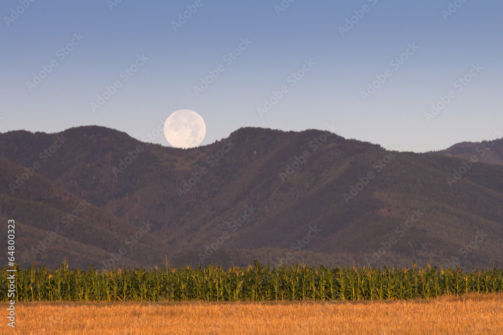 Corn Field with full moon over mountains in background