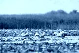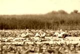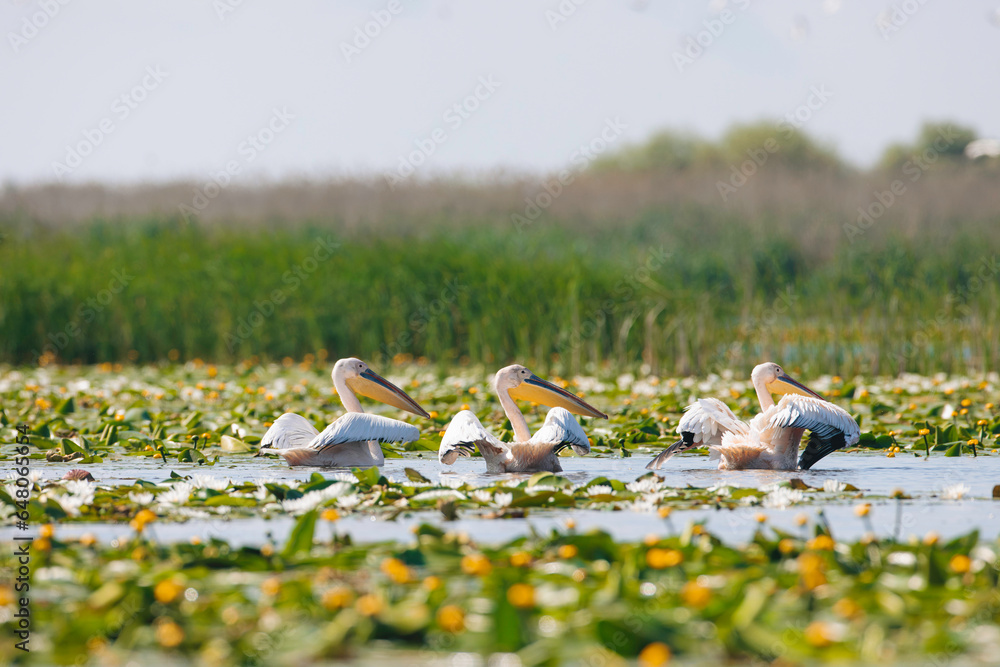 A flock of pelicans peacefully floating on the water in the diverse Danube Delta ecosystem environment conservation eco