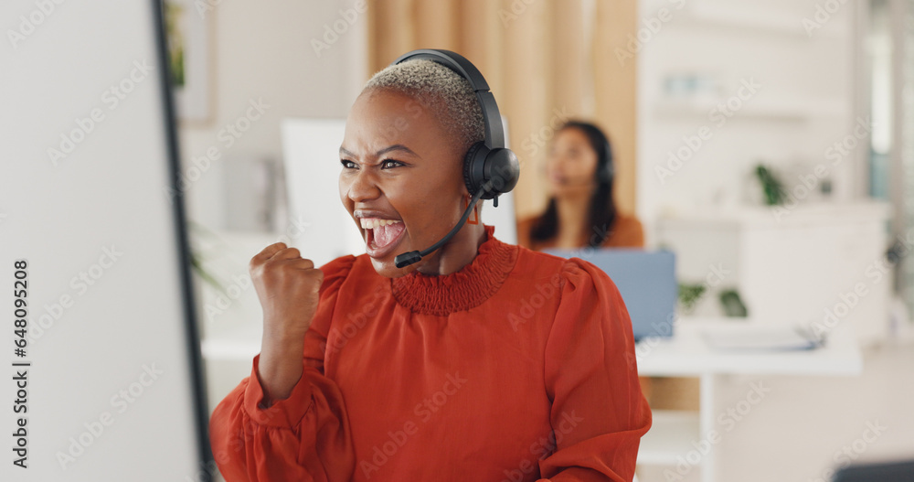 Winner, success and motivation with a black woman in a call center for customer service or support. Wow, target and celebration with a young employee consulting in a crm or telemarketing office