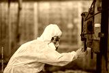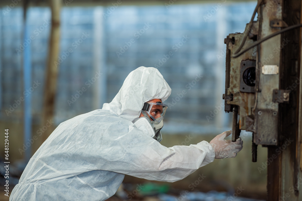 Male inspector team investigate danger chemical gas leak spill with safety face mask PPE suit in area closed barricade security tape. danger dirty area infected chemical leak spill cross stripe ribbon