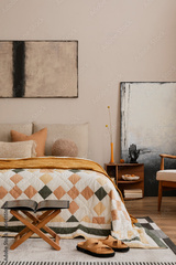 Cozy composition of bedroom interior with mock up poster frame, bed, orange bedding, corgi dog, wooden bedside table, black rack, stylish lamp, sculpture and personal accessories. Home decor. Template