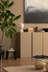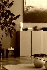 Warm and cozy composition of living room interior with mock up poster frame, brown sideboard, white armchair, stylish glass coffee table and personal accessories. Home decor. Template.