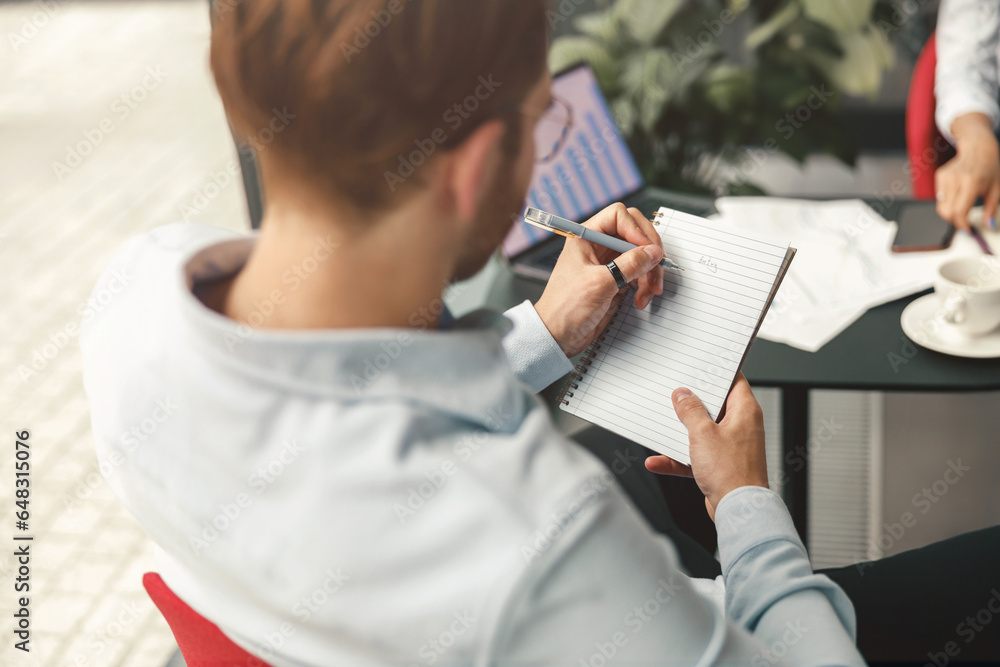 Back view of businessman making notes in notepad during meeting in office. High quality photo