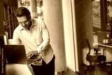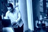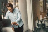 Handsome entrepreneur working on laptop standing in modern coworking during working day