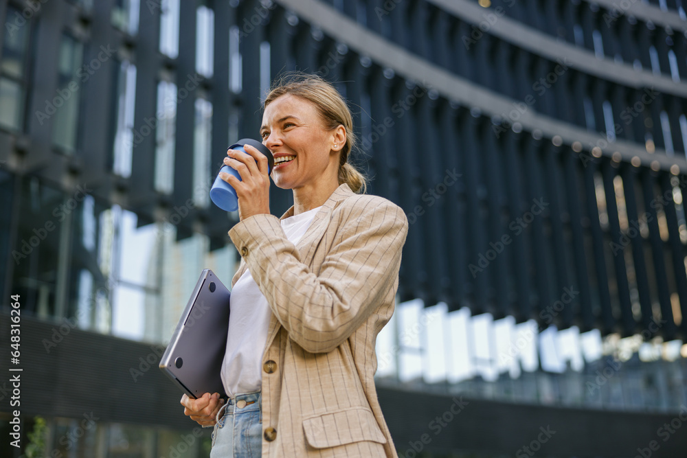 Positive female manager drinking coffee during break time near office building. High quality photo