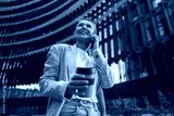 Smiling woman office worker is standing on modern building background and looking at side