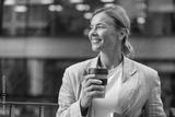 Positive female manager drinking coffee during break time near office building. High quality photo
