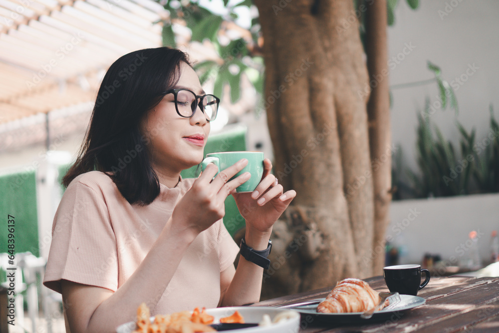 Young asian woman drinking coffee latte at a cafe