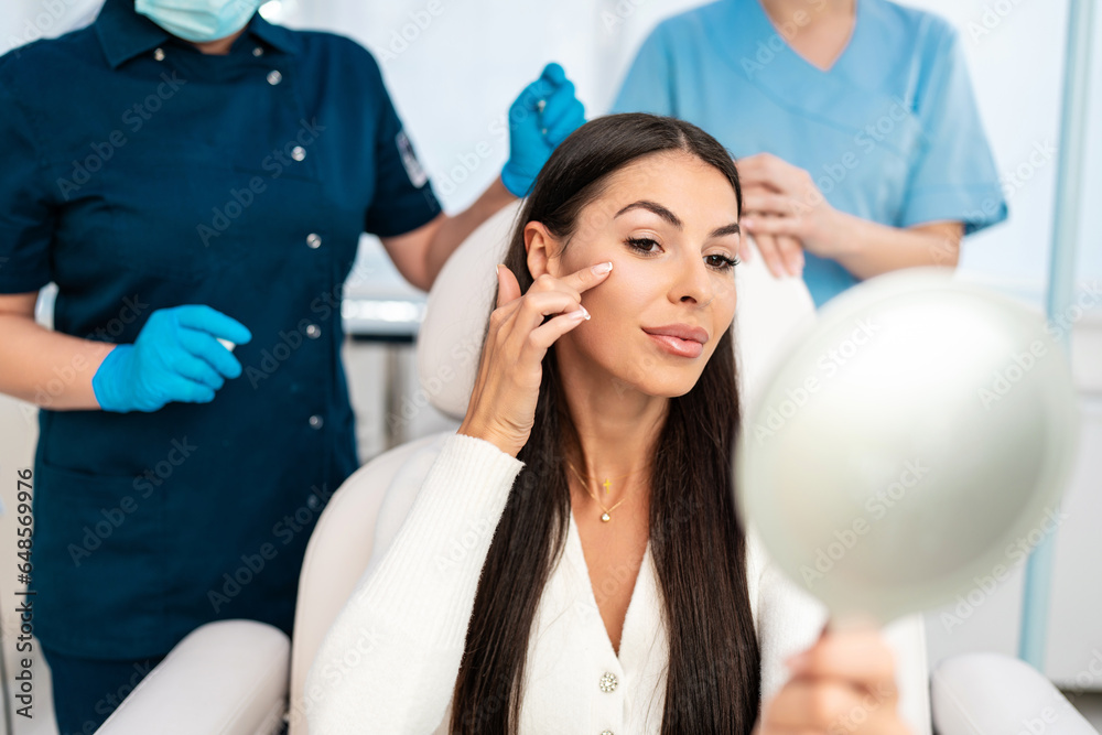 Beautiful and happy young woman sitting in medical chair and looking in the mirror. She is satisfied after successful beauty treatment with hyaluronic acid fillers or botulinum toxin injections.