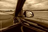 Beautiful view in side mirror of car driving along highway along wheat fields. Sweden.