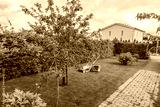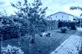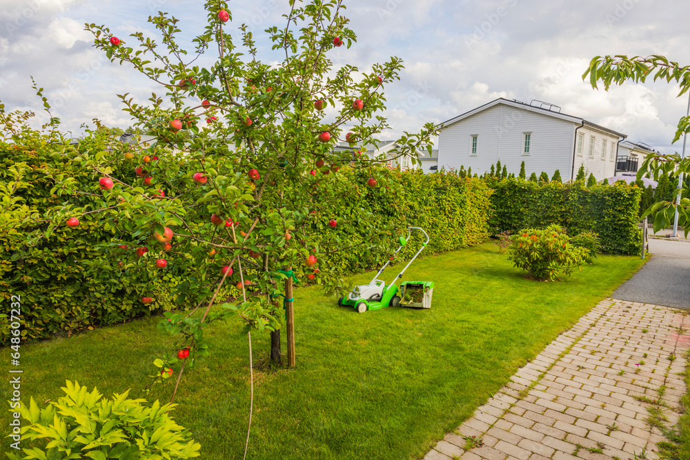 Beautiful view of private garden with lawn freshly cut with electric lawn mower, apple trees and flowers. Sweden.