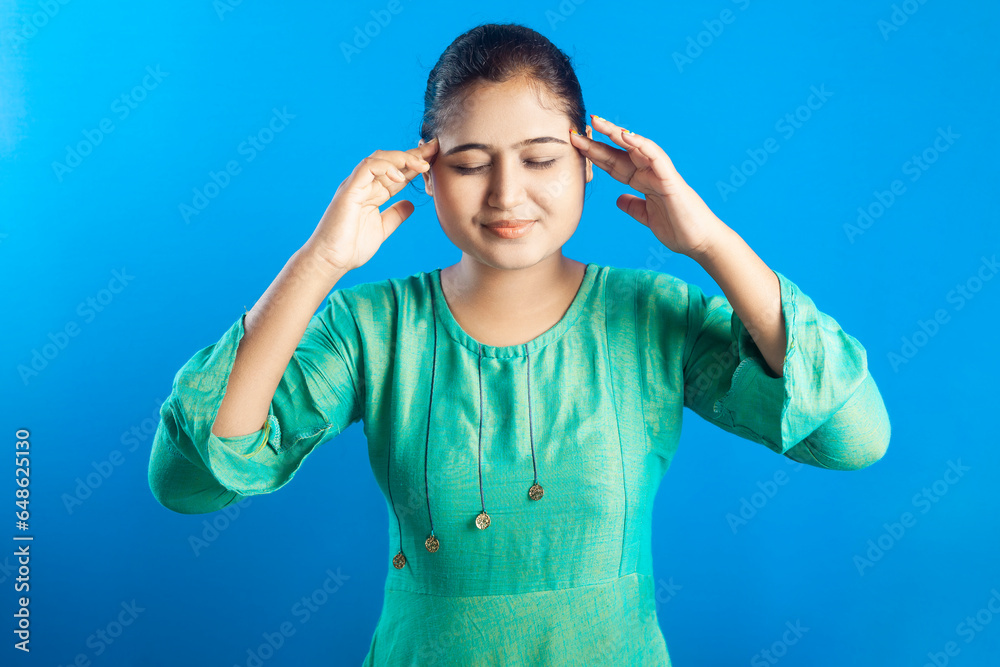 Beautiful Indian women experiencing pain in her head in blue background