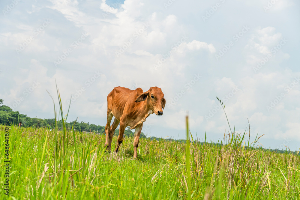 Indian cow grazing in the paddy field