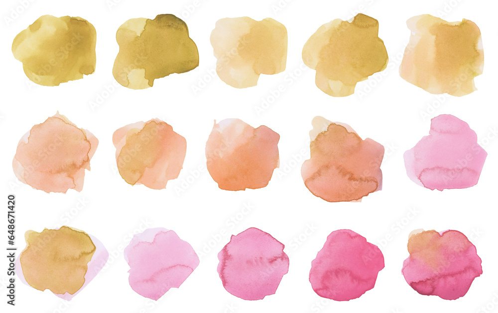 Ink watercolor hand drawn stain blot. Wet pastel color stain on white background. Set.