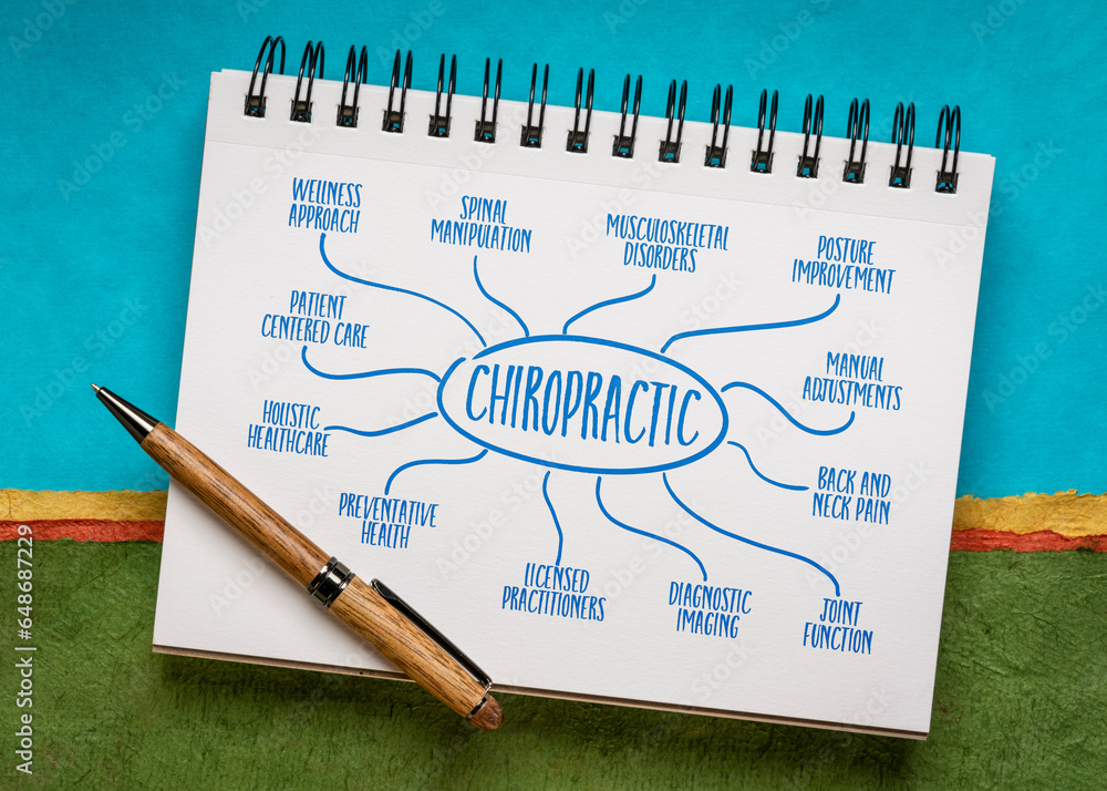 chiropractic wellness approach - infographics or mind map sketch on a spiral notebook, holistic healthcare and alternative medicine concept