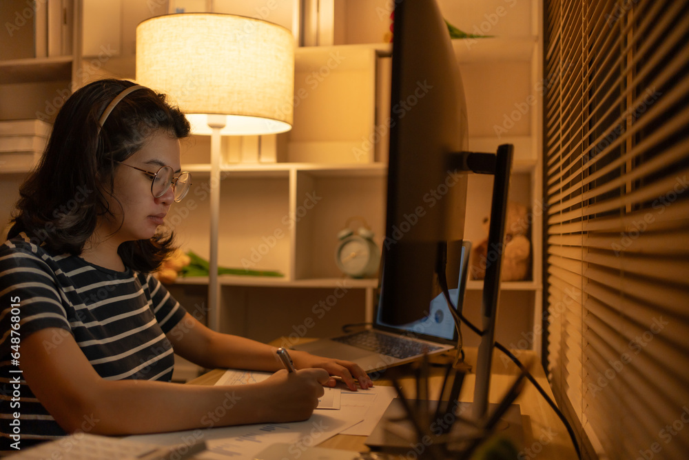 Late-Night Online Education, Dedicated Young Woman Studying Online Late at Night in Her Home Office, Work for home.