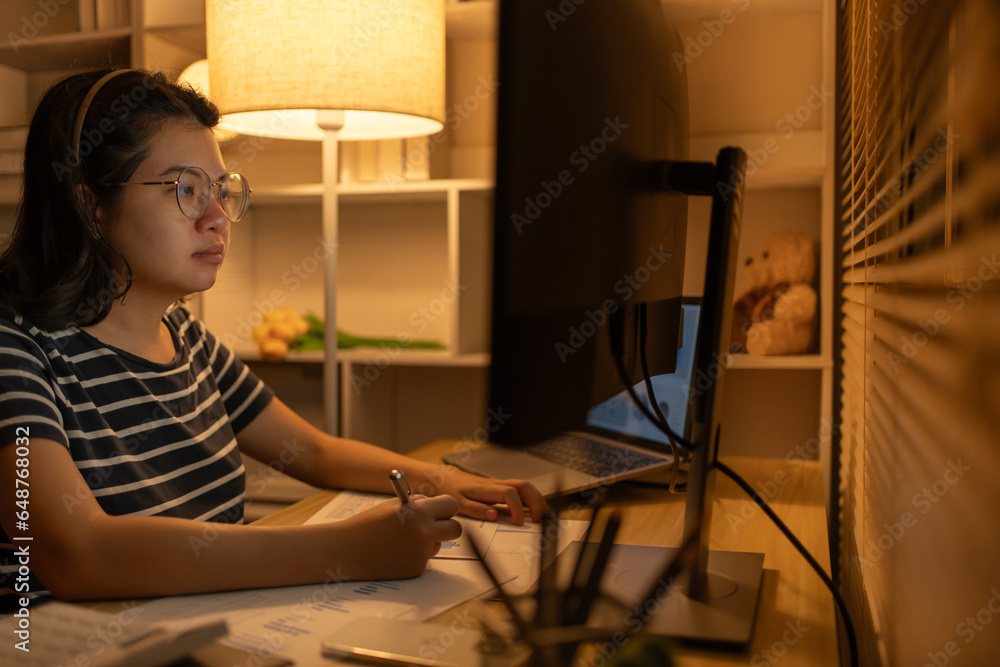 Late-Night Online Education, Dedicated Young Woman Studying Online Late at Night in Her Home Office, Work for home.