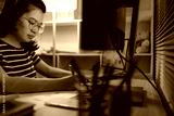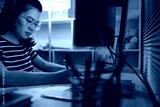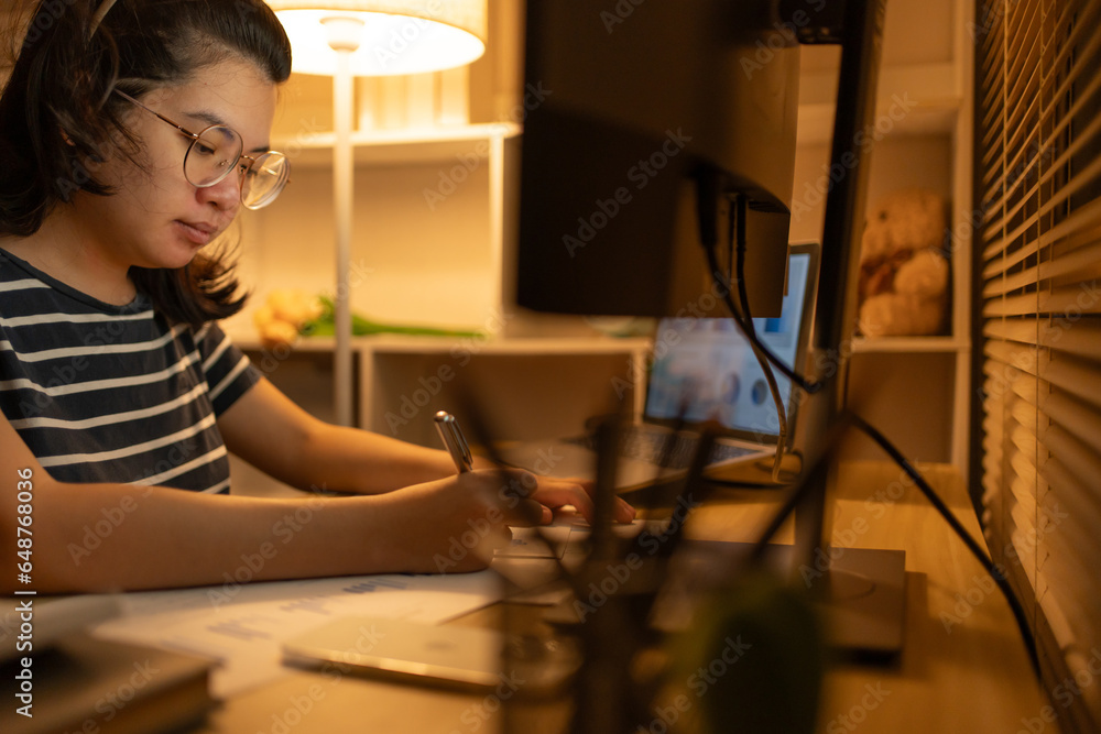 Late-Night Online Education, Dedicated Young Woman Studying Online Late at Night in Her Home Office, Work for home.